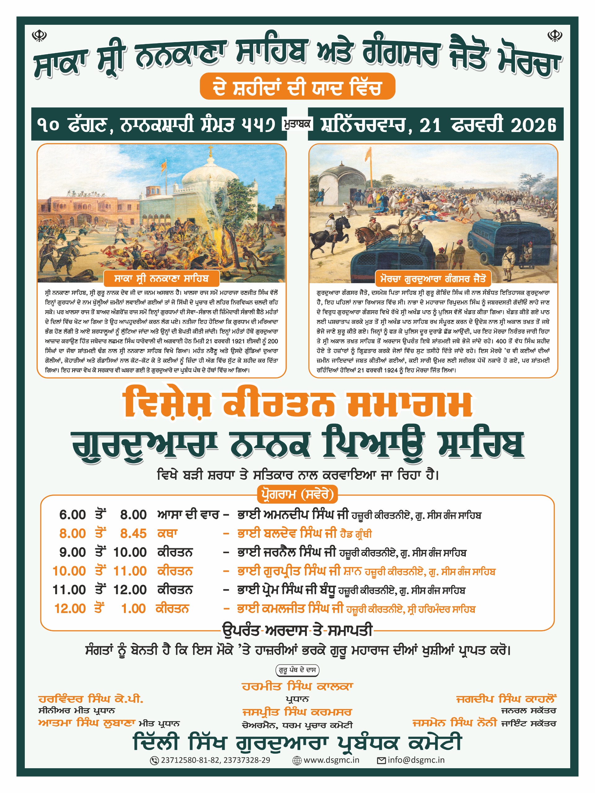 ਸਾਕਾ ਸ੍ਰੀ ਨਨਕਾਣਾ ਸਹਿਬ ਅਤੇ ਗੰਗਸਰ ਜੈਤੋ ਮੋਰਚਾ ਦੇ ਸ਼ਹੀਦਾਂ ਨੂੰ ਸਮਰਪਿਤ ਵਿਸ਼ੇਸ਼ ਕੀਰਤਨ ਸਮਾਗਮ