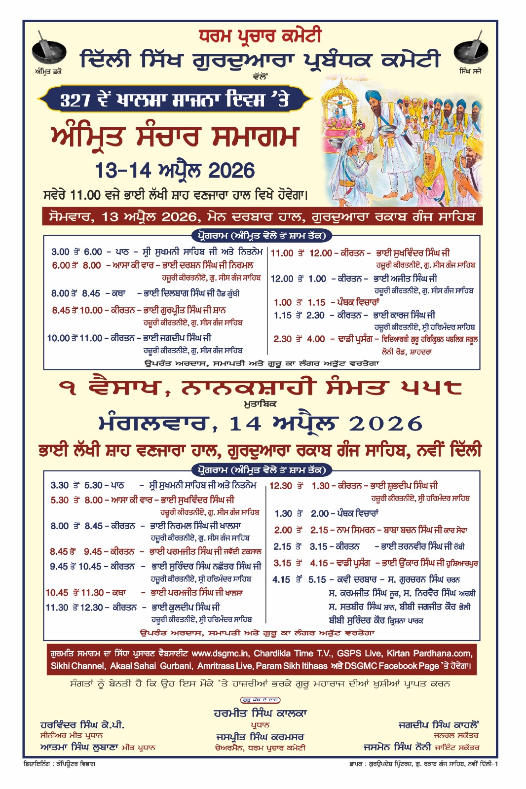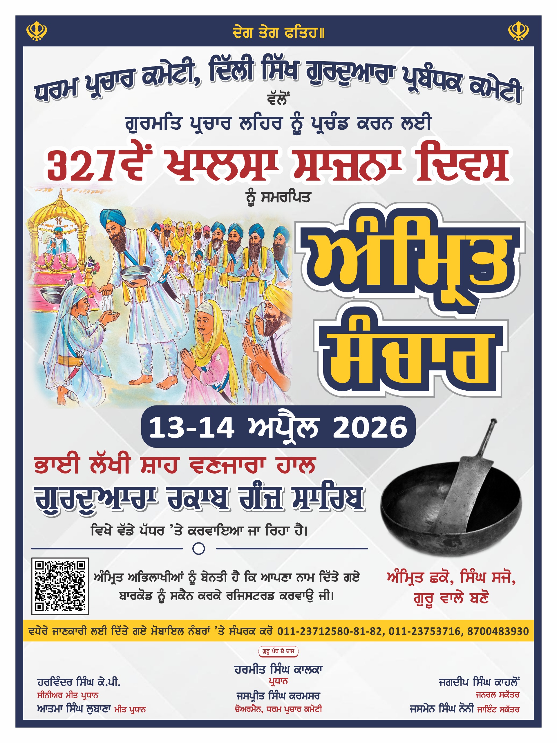 327ਵੇਂ ਖਾਲਸਾ ਸਾਜਨਾ ਦਿਵਸ ਨੂੰ ਸਮਰਪਿਤ ਅੰਮ੍ਰਿਤ ਸੰਚਾਰ 13-14 ਅਪ੍ਰੈਲ ਨੂੰ