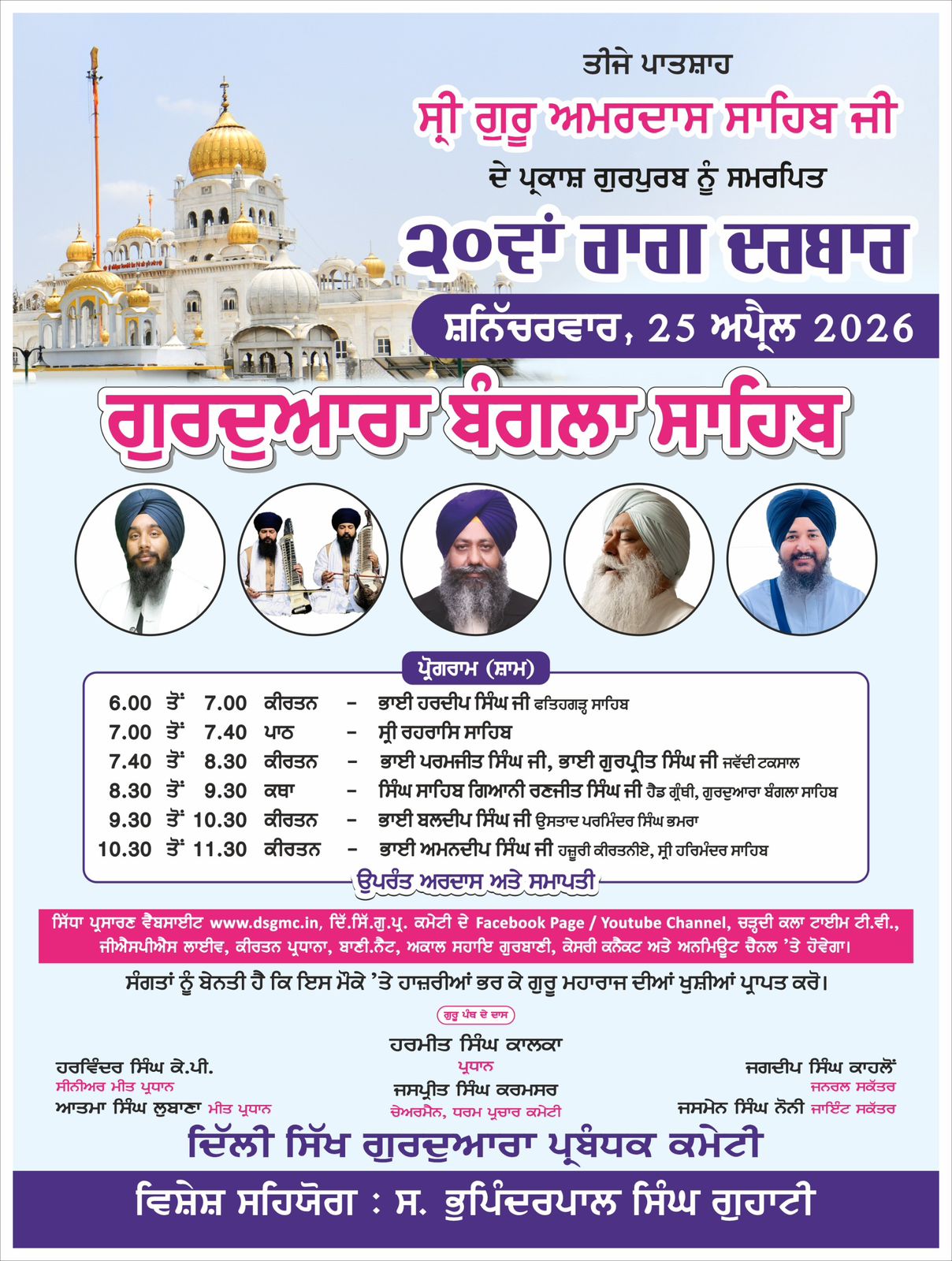 ਰਾਗ ਦਰਬਾਰ ਗੁਰਦੁਵਾਰਾ ਬੰਗਲਾ ਸਾਹਿਬ 25 ਅਪ੍ਰੈਲ ਨੂੰ